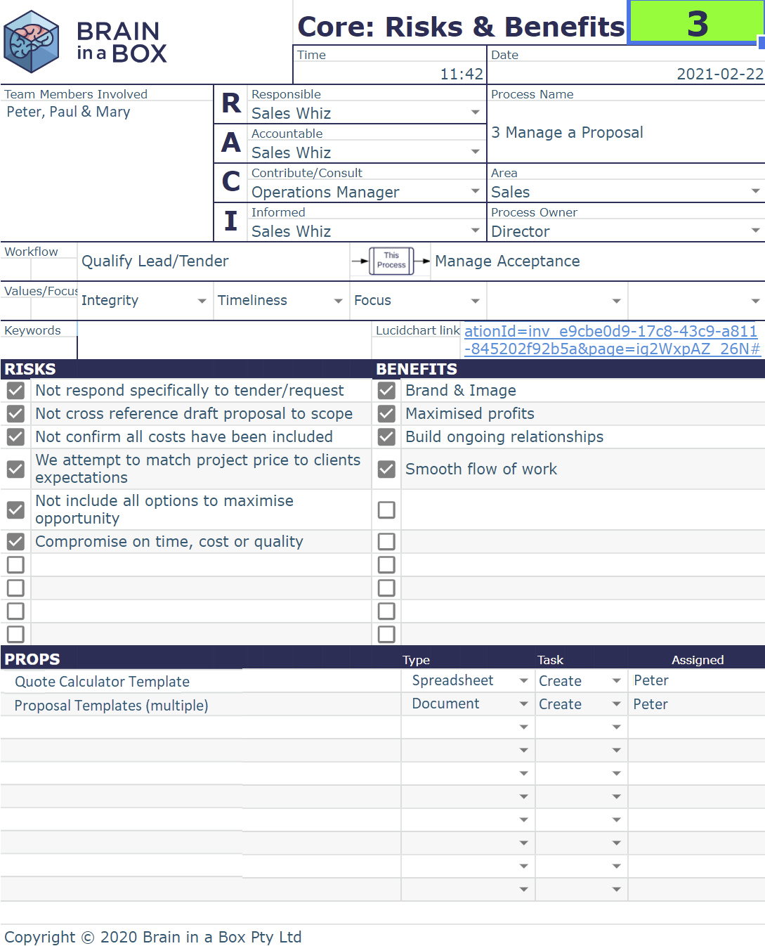 Clarify what is required This step covers the actual process to move from the input stage through to output, taking note of the risks within the process, the benefits that can be achieved if the process is followed as written, and noting the roles required to complete the process | We noted the risks based on the team’s past experience: not using standard client details on the label; not recording the tub number, not updating the register when physical records were removed or replaced. The benefits were obvious: 100% reliability in record-keeping, minimal time spent accessing records and less frustration all round. |
