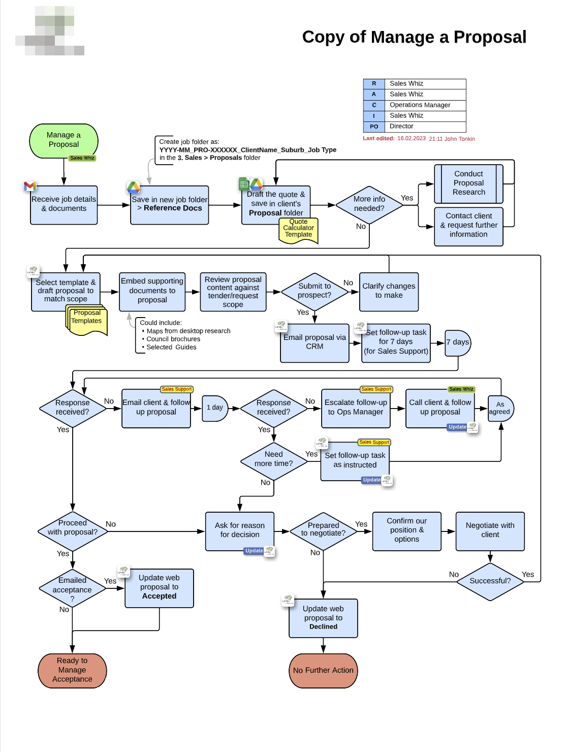 Launch the Process The fifth step involves refining the process that we mapped to make sure that it matches internal standards, and then to deploy or publish the process to the client Internet. It is then up to the client to implement the system within the business which means training first of all the team, and then as the need arises, the company, the business suppliers and clients. There may also be an opportunity to display the process on the website or in marketing or other materials. | With everything ‘signed off’ we published the new process to their intranet, along with the register.